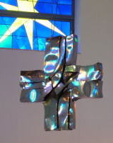 ステンドグラスの色が 映り込む十字架
