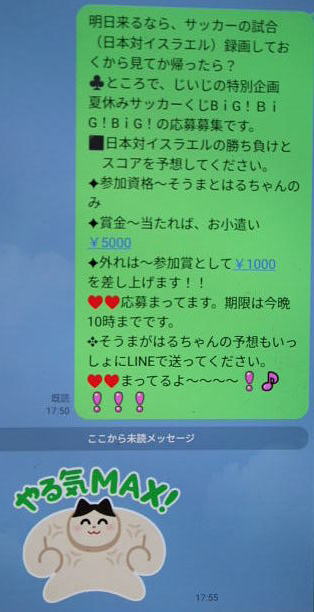 部活の合間にお昼を食べにくるという ソーくんに じいじの夏休みナイス企画 今年は ただいまパリオリンピック 開催中なので ソーくんにラインし サッカーの日本勝ち負けと得点予想クイズ 賞金の封筒まで手作り (遊んでるね じいじ^0^)